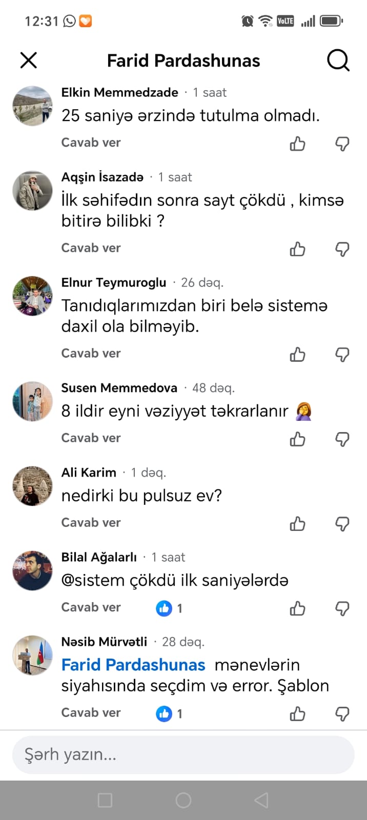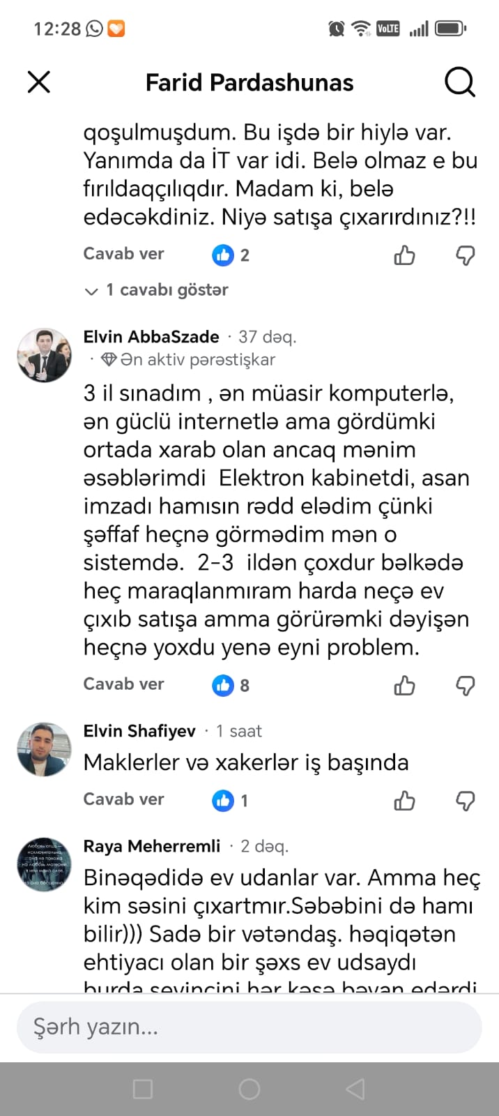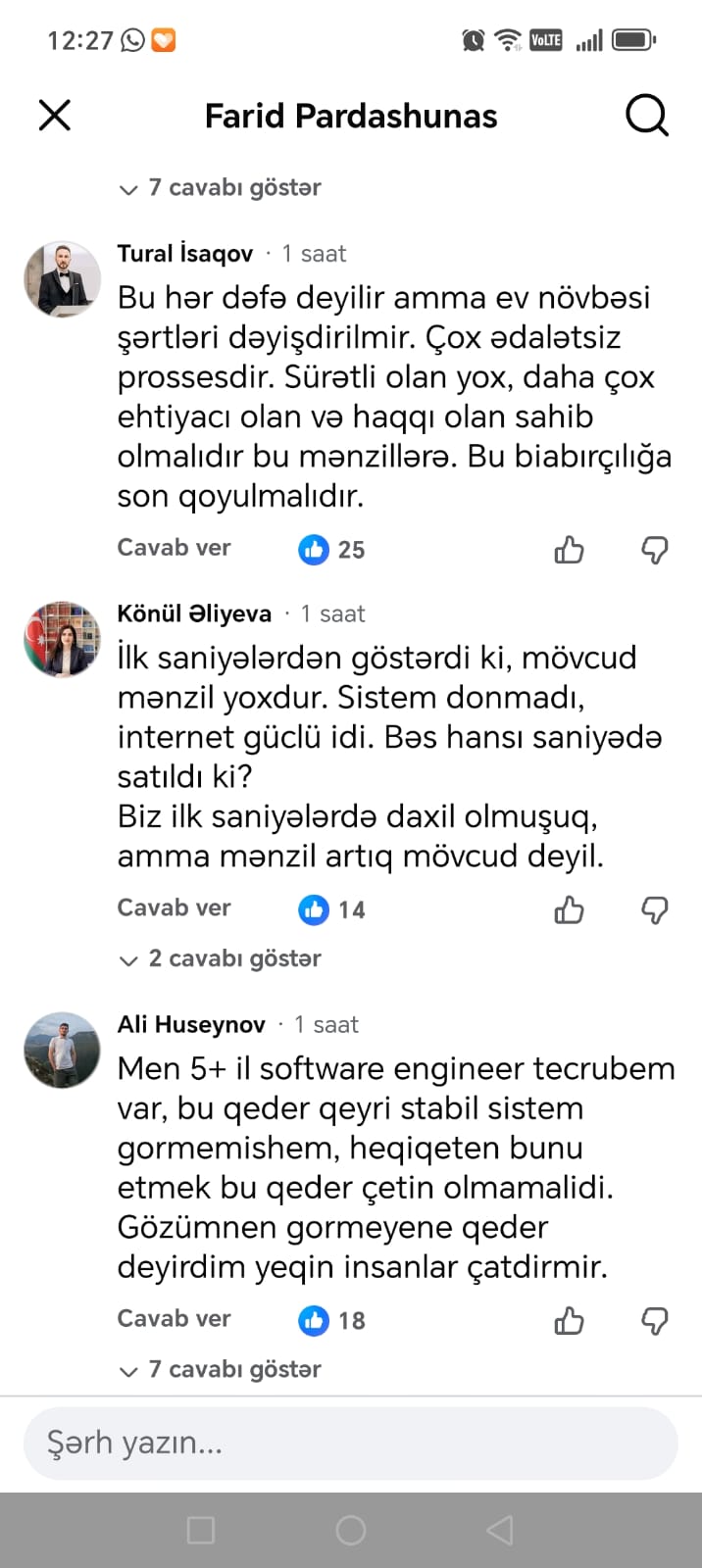 “Sistem donmadı, internet güclü idi. Bəs hansı saniyədə satıldı ki? İlk saniyədə daxil olmuşuq, ancaq mənzil artıq mövcud deyildi”.