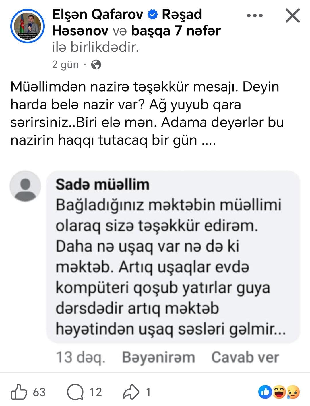 Təhsil eksperti Elşən Qafarov bağlanan məktəblərdən birinin müəlliminin Elm və təhsil naziri Emin Əmrullayevə “təşəkkür” mesajını paylaşıb.