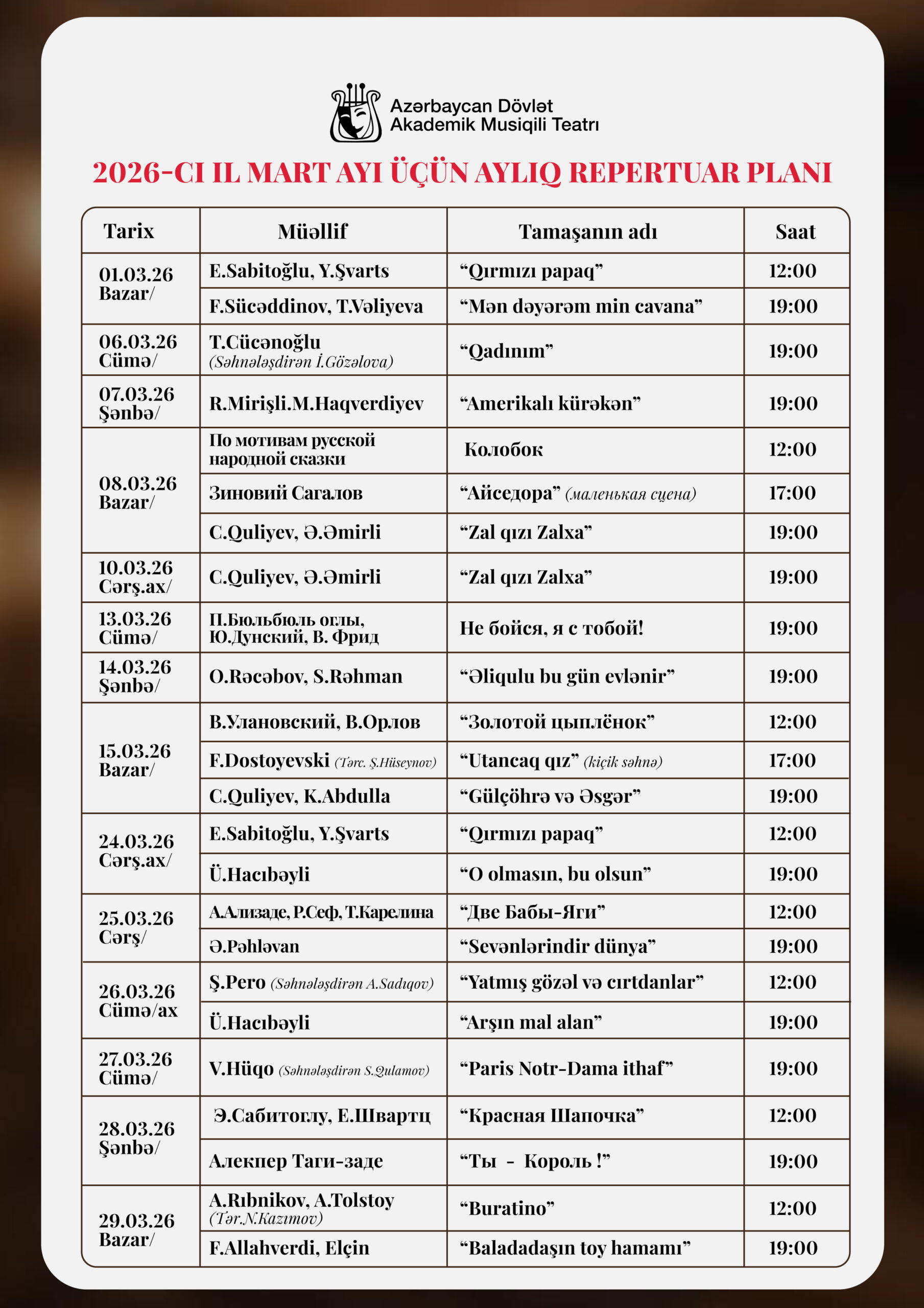 Tribuna.az sənət ocağının növbəti ay üçün nəzərdə tutulan repertuar planını təqdim edir.
