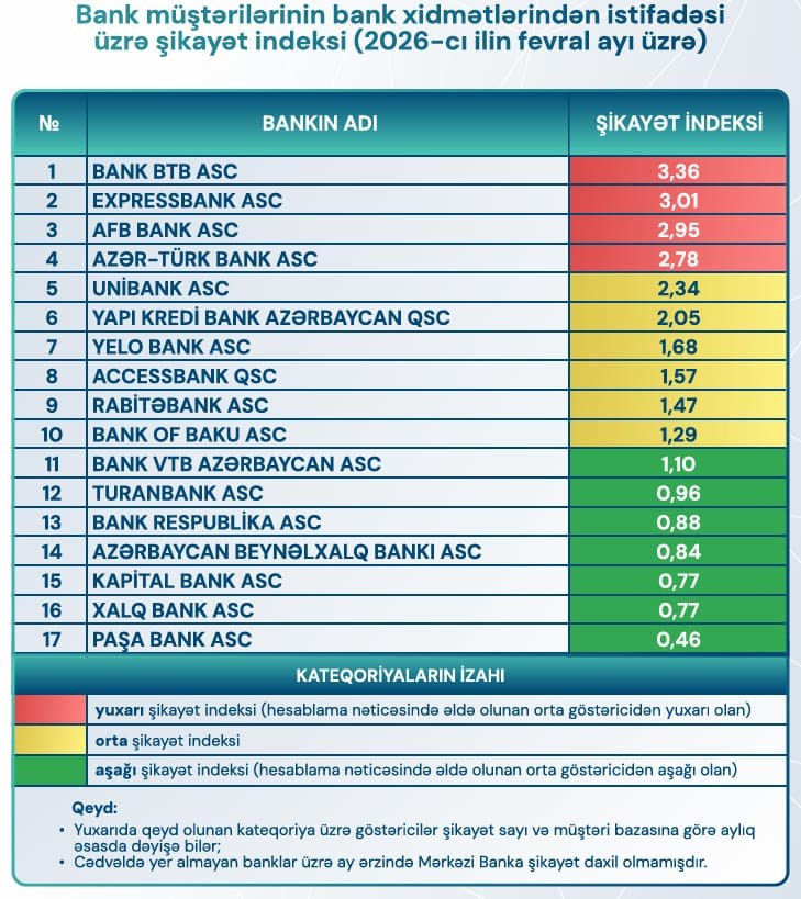 Ölkədə fəaliyyətdə olan bank müştərilərinin bank xidmətlərindən istifadəsi üzrə şikayət indeksii açıqlanıb.