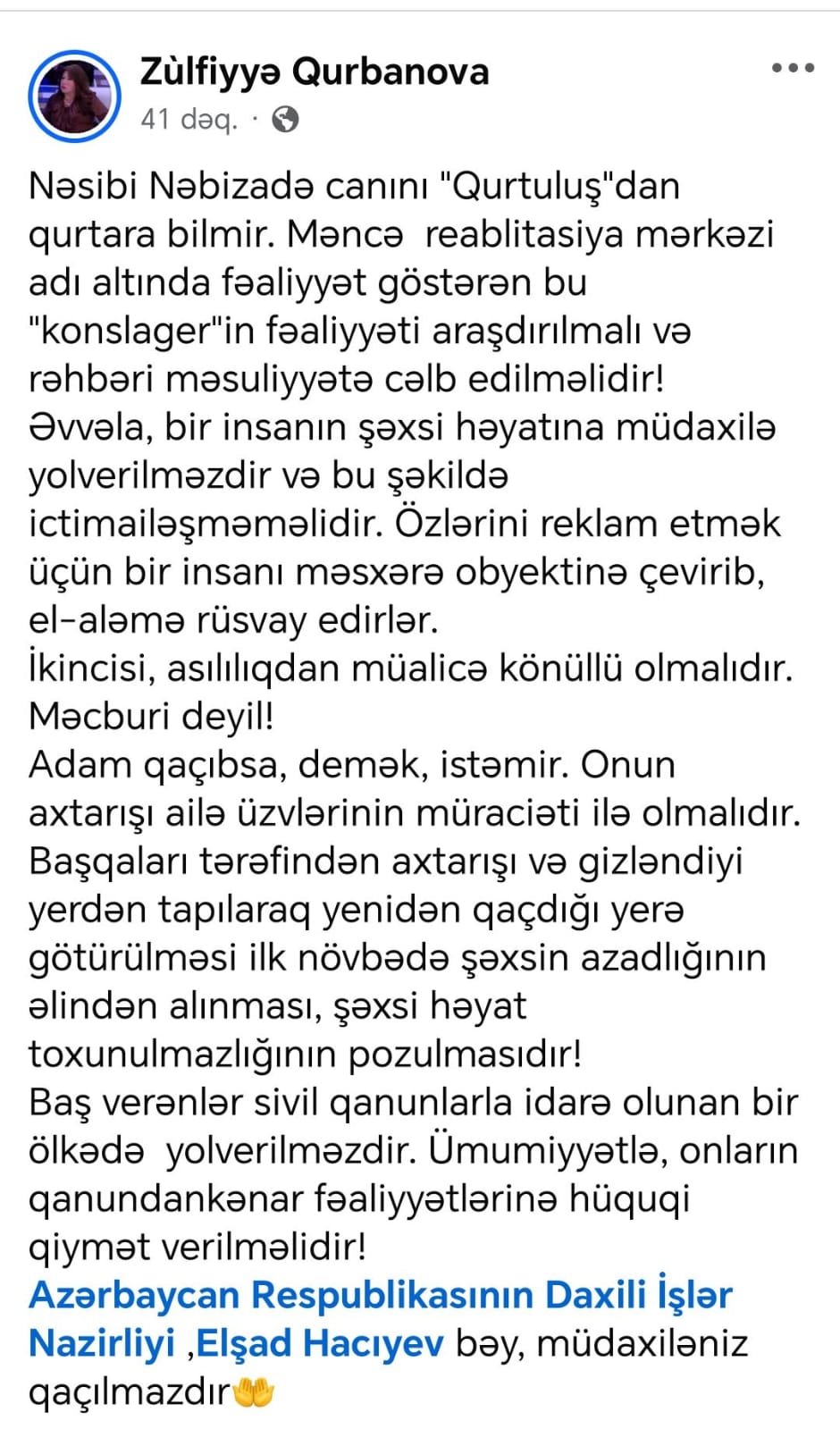 Z.Qurbanova Daxili İşlər Nazirliyini məsələyə müdaxilə etməyə səsləyib.