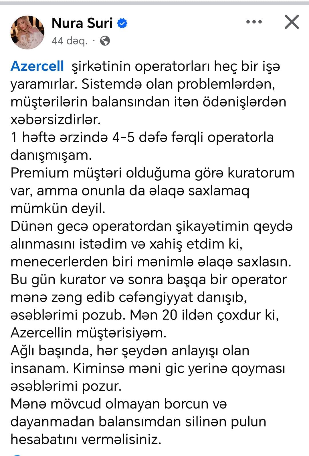 Müğənni Nura Suri mobil operator” Azercell”in xidmətindən ciddi narazılığını ifadə edib. O, sosial media hesabında paylaşdığı açıqlamada şirkətin operatorlarını, müştəri xidməti sistemini və ümumi xidmət keyfiyyətini sərt tənqid edib.