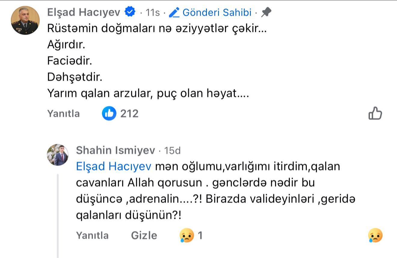 Bu şərhdən sonra isə Elşad Hacıyev sosial şəbəkə hesabında çağırış edib: “Təskinliyi olmayan atadan çağırış… Avtomobil qəzasında oğlu Rüstəmi itirən ata – Şahin İsmiyev gənclərə çağırış edib. Övlad itkisi ən ağır sınaqdır. Rüstəmi itirən ata Şahin İsmiyevin kədərini bölüşür, ailəsinə Allahdan səbir diləyirik. Daha Rüstəmlər ölməsin”.