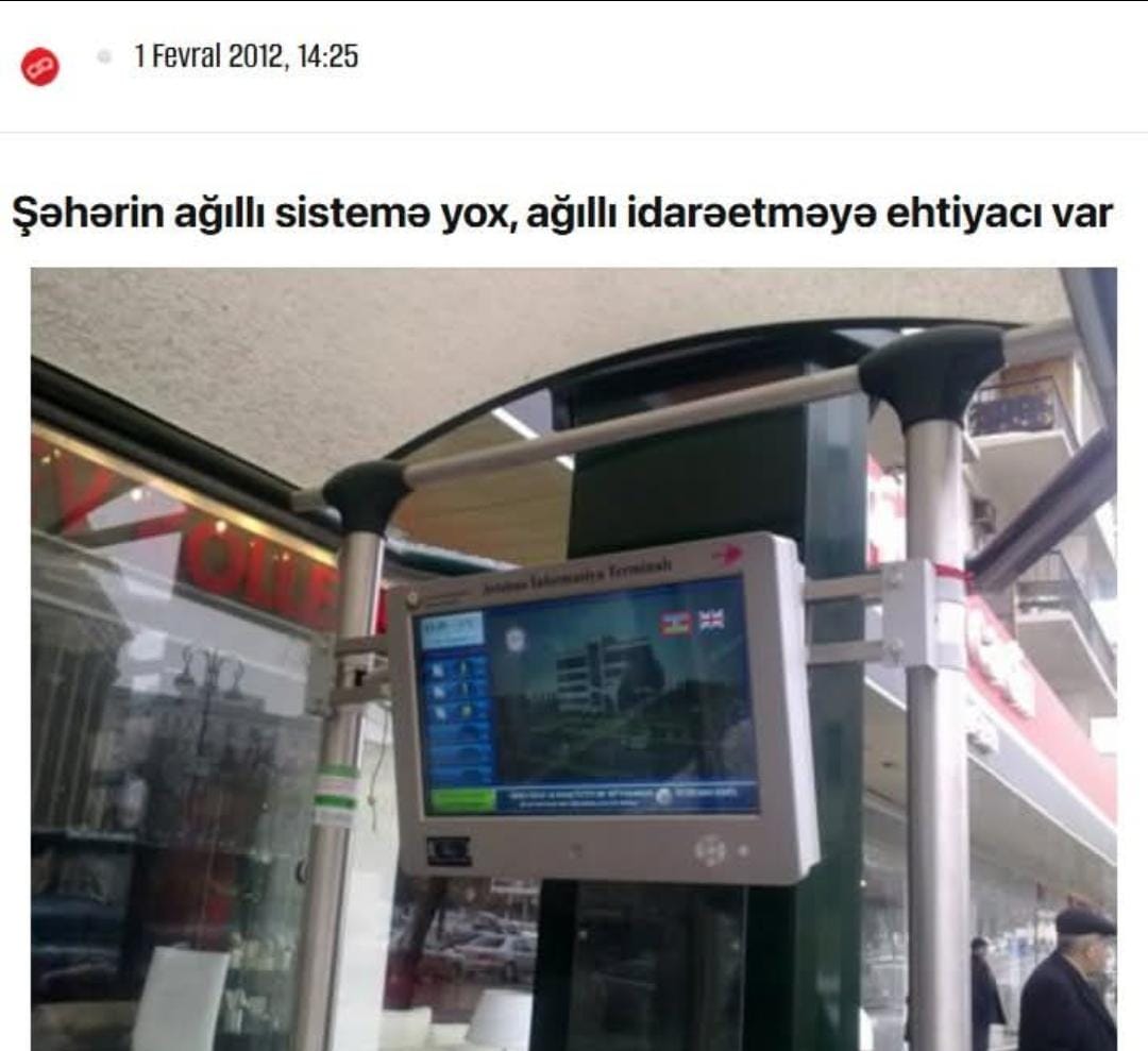 Hə, bəs nə oldu bu suppppper intellektual sistemə, nə ilə yadda qaldı?! Deyim də, ən yadda qalan məsələ, bu sistemi quran, idarə edən məmurların varlanması və bir də dayanacaqda -55 dərəcə şaxta olduğunu göstərən monitor oldu. Sonra nə həmin dayanacaqlar qaldı, nə də monitorlar, 125 mln. dollar da “intellektual” məmurlara (layihənin kuratoru Ziya Məmmədov idi) yem oldu.