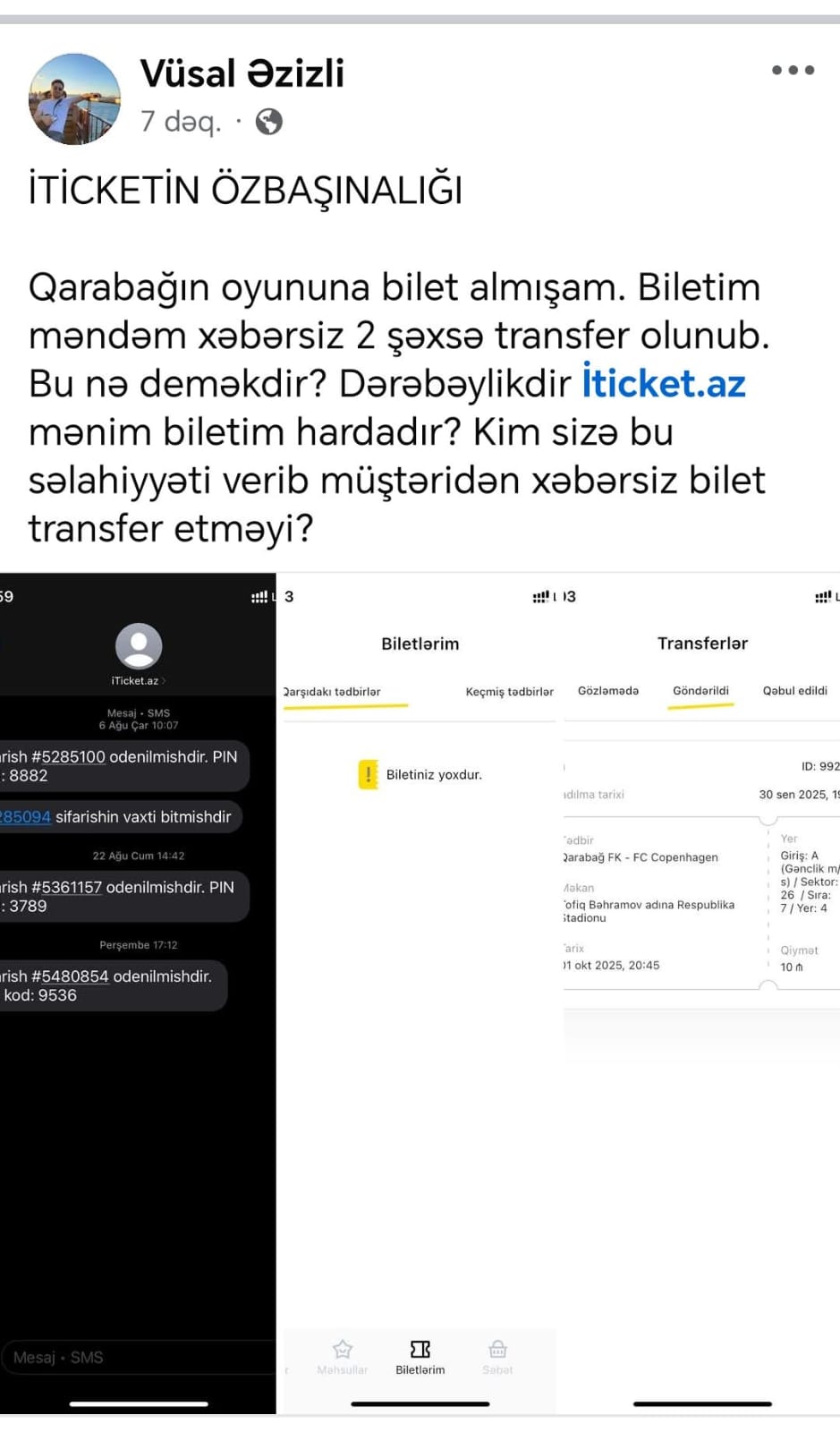 Tribuna.az xəbər verir ki, bu problemlə üzləşən şikayətçi Vüsal Əzizli problemini sosial şəbəkədə ictimailəşdirib. O bildirib ki, “Qarabağ”ın oyununa bilet alıb, ancaq bileti özündən xəbərsiz 2 şəxsə transfer olunub: