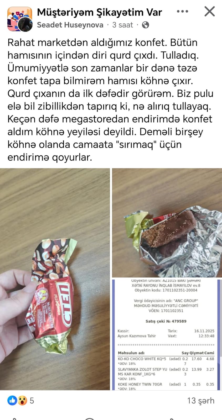 Tribuna-nın məlumatına görə, bu barədə sosial şəbəkədə şikayətçi Səadət Hüseynova yazıb. O bildirib ki, kilo ilə satılan “Step” konfetlərinin hamısının içi qurdlu olub: