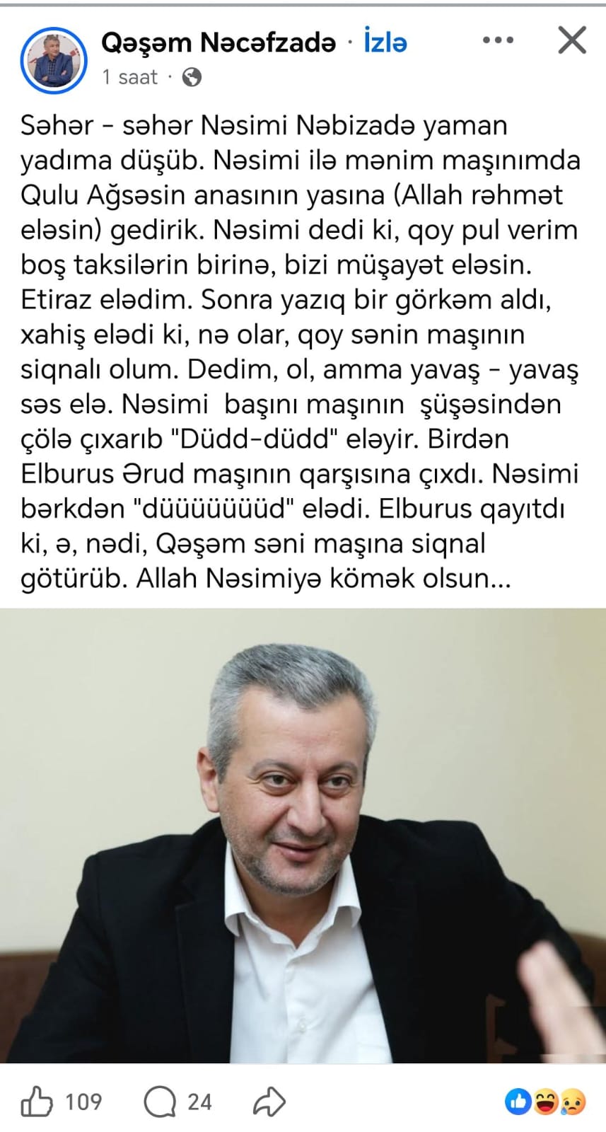 “Səhər – səhər Nəsimi Nəbizadə yaman yadıma düşüb. Nəsimi ilə mənim maşınımda Qulu Ağsəsin anasının yasına (Allah rəhmət eləsin) gedirik. Nəsimi dedi ki, qoy pul verim boş taksilərin birinə, bizi müşayət eləsin. Etiraz elədim. Sonra yazıq bir görkəm aldı, xahiş elədi ki, nə olar, qoy sənin maşınının siqnalı olum. Dedim, ol, amma yavaş – yavaş səs elə.