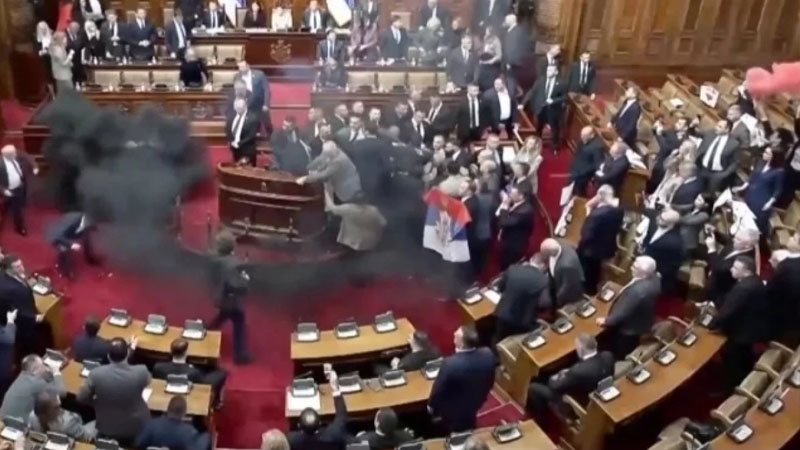 Bir müddət sonra müxalifətçi deputat Radomir Lazoviç çıxış üçün növbəsiz tribunaya yönəlib, lakin onu dayandırmağa çalışıblar və nəticədə digər deputatlarla qarşıdurma yaranıb. Zalda tüstü qumbaraları partladılıb. Cavab olaraq, hakim Serbiya Tərəqq