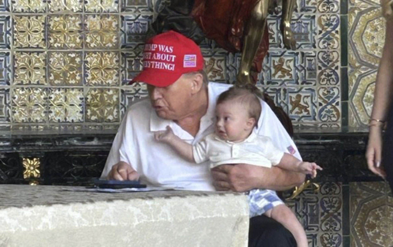 Fotoda Tramp nəvəsini qucağına alıb masa arxasında oturub.