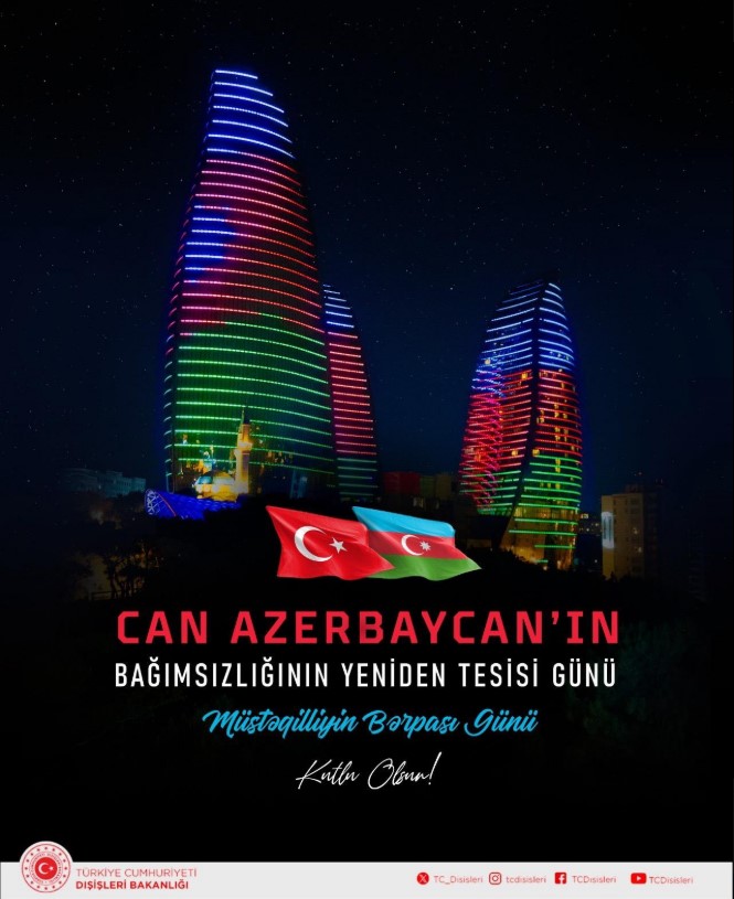 Həmçinin Türkiyə Xarici İşlər Nazirliyi də Müstəqilliyin Bərpası Günü ilə bağlı paylaşım edib: “Müttəfiqimiz, qardaş Azərbaycanın Müstəqilliyinin Bərpasının 34-cü ildönümü mübarək olsun!”