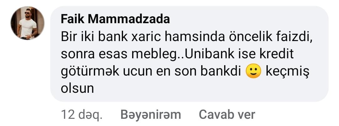 “Mən artıq “Unibank”ın yalançı məlumat verən operatorlarından yoruldum. “Unibank”da kreditim var. Krediti götürəndə soruşdum ki, aylıq ödənişdən artıq ödəsəm, bunu əsas məblığdən silmək olar ki, faiz aşağı düşsün. Bankdan bildirdilər ki, bəli, mümkündür. Artıq ödəniş edirəm, ancaq ödəniş məbləğə yox, kreditə yönəlir. Bankın operatorlarının hərəsi bir nağıl danışır. Krediti onlayn sifariş edəndə mənə heç bir komissiya olmadığını dedilər. Ancaq indi komissiya tuturlar. Bütün banklarda artıq ödənişi əsas məbləğə yönləndirmək olur. “Unibank” isə nağıl danışır”.