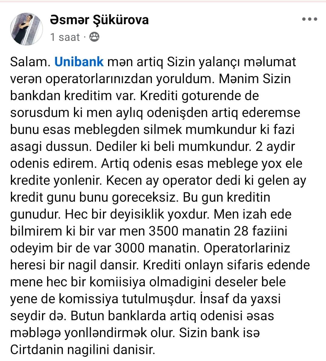 Tribuna.az xəbər verir ki, sözügedən bankdan kredit götürüb peşman olanlardan biri də Əsmər Şükürovadır. O bildirib ki, xüsusilə “Unibank”ın operatorları, əməkdaşları müştəriyə yalan danışır: