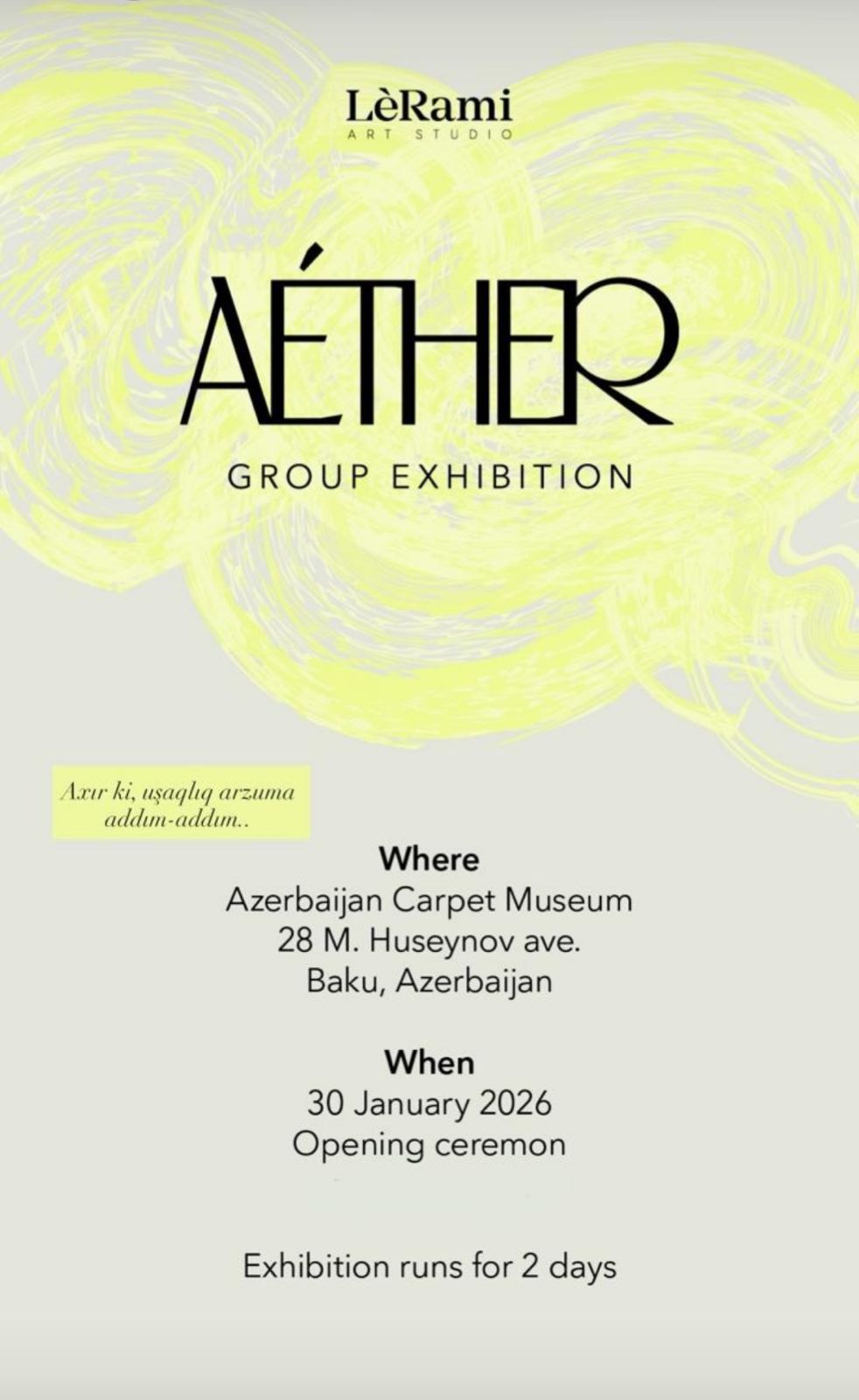 Azərbaycan Rəssamlar İttifaqının üzvü, rəssam, pedaqoq və kurator Ramilə Şamilovanın rəhbərliyi ilə fəaliyyət göstərən “LèRami” art studionun tələbələrinin iştirakı ilə “Aether” adlı qrup sərgisi təşkil olunacaq.