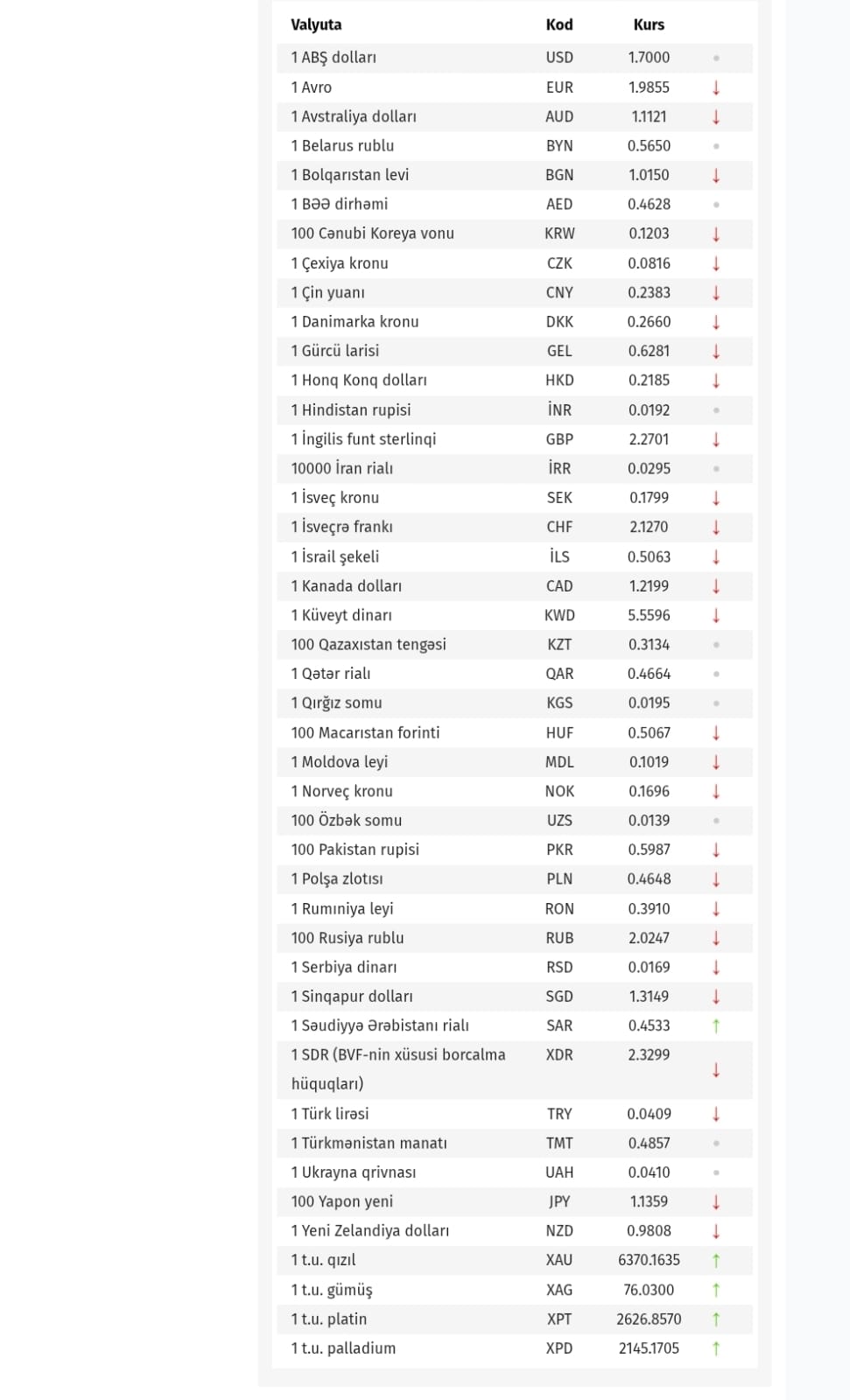 Azərbaycan Mərkəzi Bankı bu günün valyuta məzənnələrini açıqlayıb.