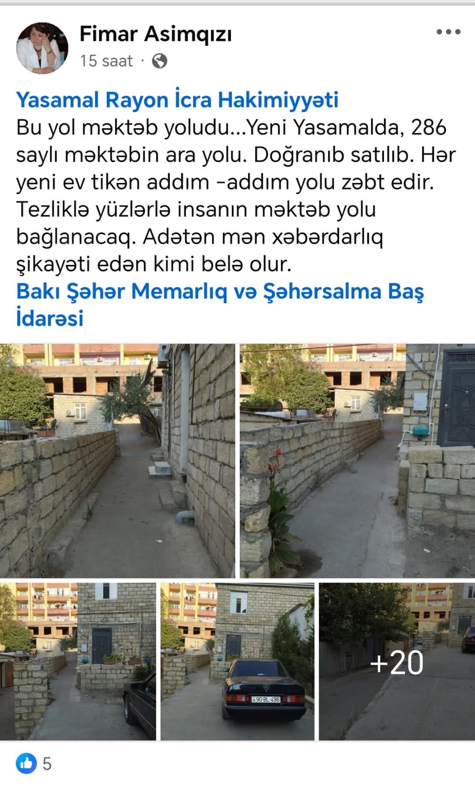 Tribuna.az xəbər verir ki, sosial şəbəkədə məsələ ilə bağlı paylaşım edən jurnalist Fimar Asimqızı yazır ki, zəbt edilərək hissə-hissə satılan ərazi məktib yoludur: