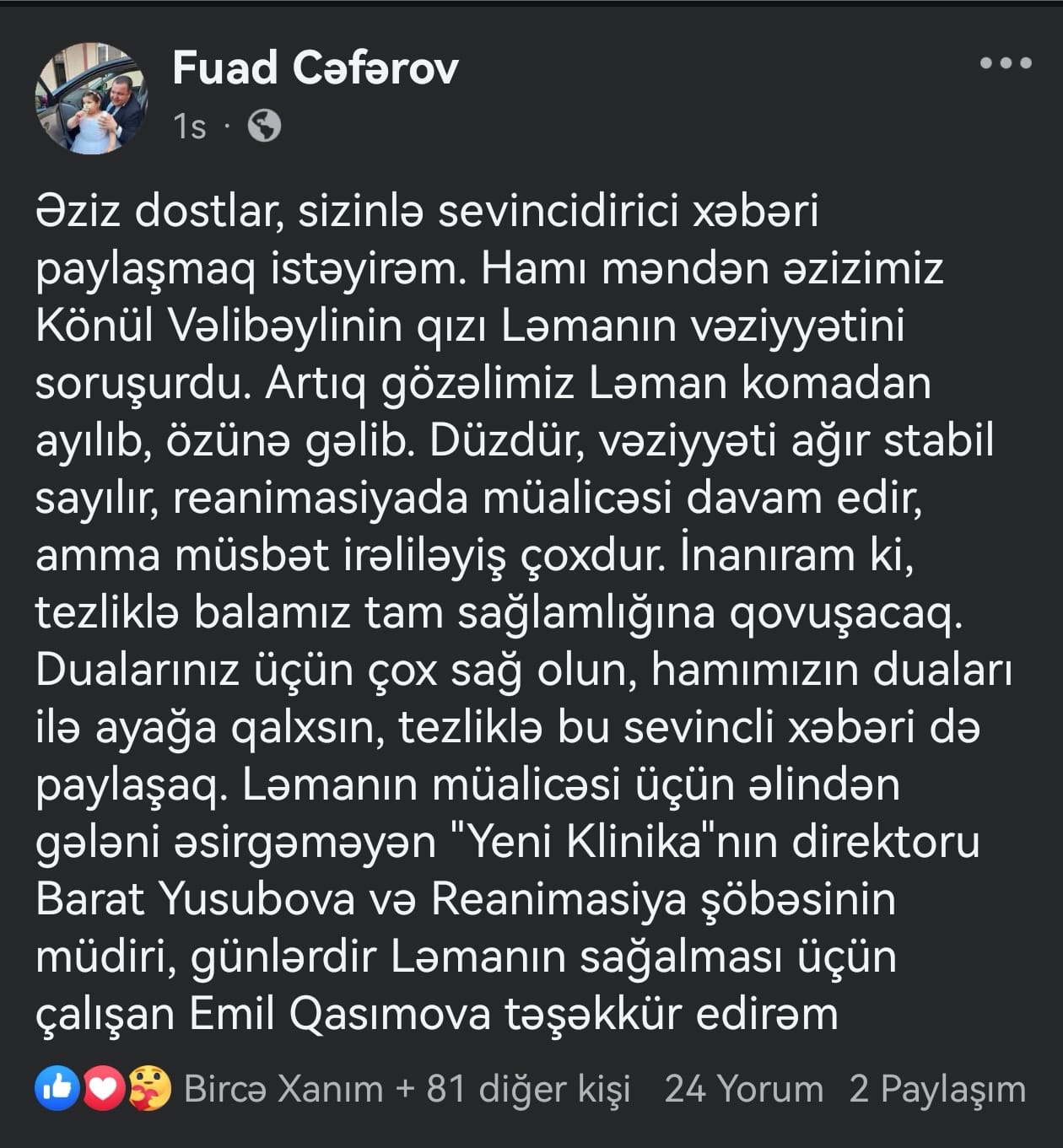 Tribuna.az xəbər verir ki, onların yaxını Fuad Cəfərov sosial şəbəkədə Ləmanın səhhəti ilə bağlı sevindirici xəbər paylaşıb.