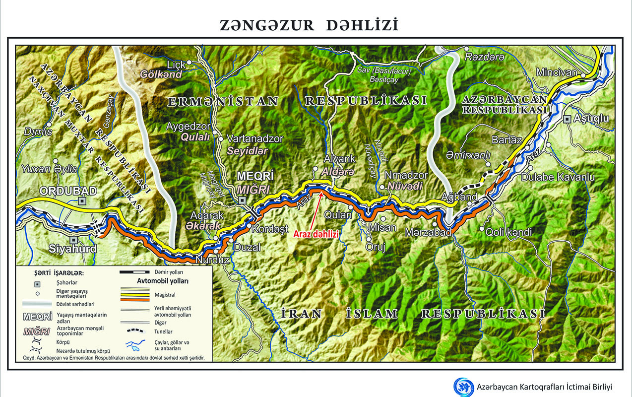 “Azərbaycan Kartoqrafları” İctimai Birliyi Zəngəzur dəhlizinin xəritəsini hazırlayıb. Xəritənin altlığı yüksək keyfiyyətli kosmik şəkillər əsasında tərtib edilib.
